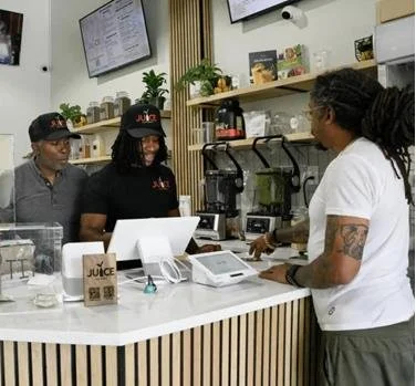 Our shop reflects who we are, four Queens natives who value fresh starts, bold flavors, and people-first energy. From the music you hear when you walk in, to the affirmations you see on the wall, to the local artists featured in our space, everything is intentional. Our juices are crafted with care, using real, whole ingredients and a deep understanding of how nutrition supports the body, especially in Black and Brown communities where access and education around wellness are often limited.